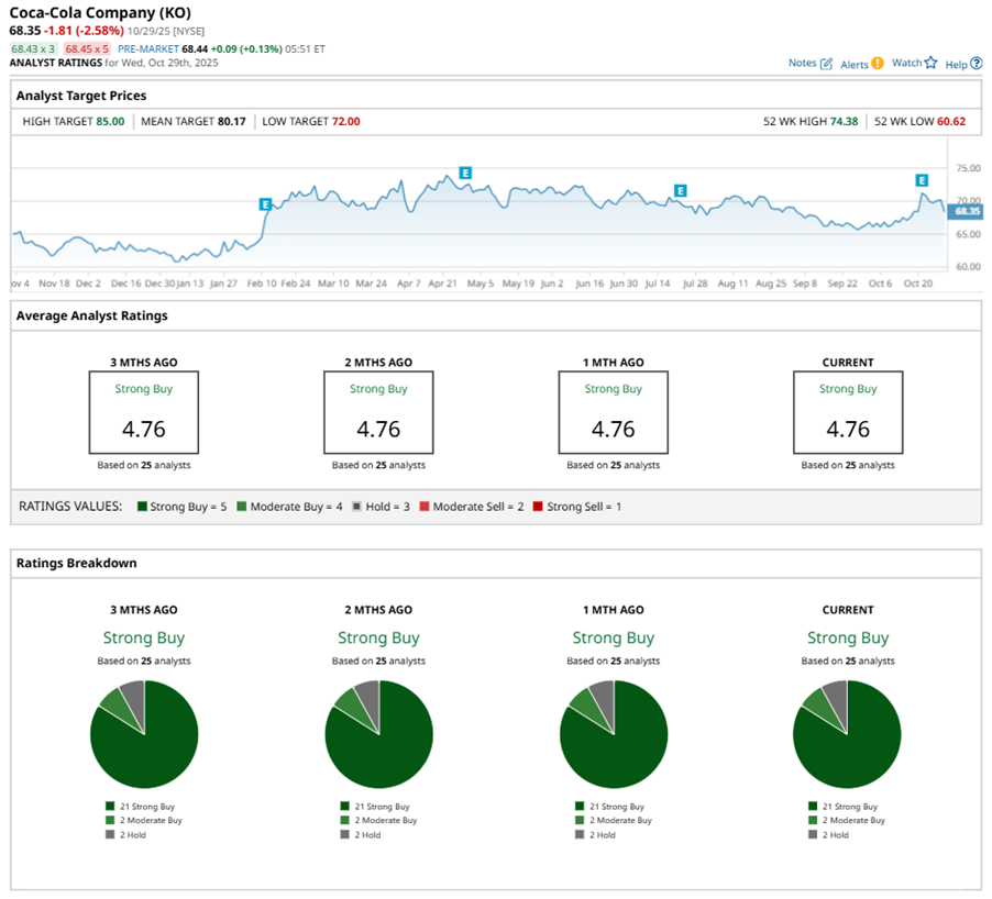 Among the 25 analysts covering KO stock, the consensus is a “Strong Buy.” That’s based on 21 “Strong Buy” ratings, two “Moderate Buys,” and two “Holds.”