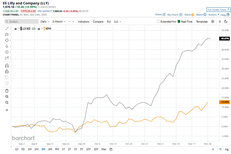 Over the long haul, Eli Lilly has continued to assert its dominance, gaining 38.6% year-to-date, comfortably outpacing XPH’s 24% climb. Its momentum is even clearer over the past 52 weeks, with the stock advancing 43.1% versus the ETF’s 14.4% rise.