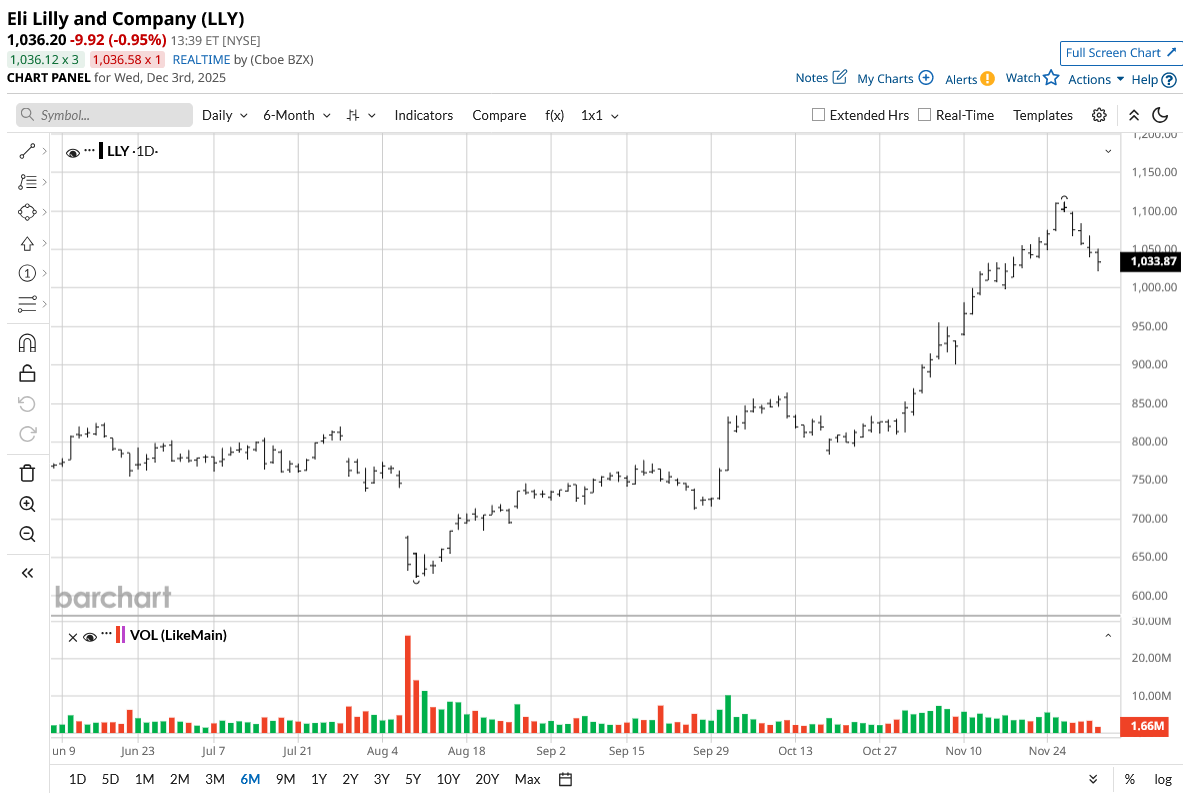 Eli Lilly's stock has shown strong performance in 2025. Over the past five days, shares experienced minor volatility, with a decline of approximately 7%, while the one-month gain reached around 15%. In six months, LLY rose around 38%, and year-to-date (YTD) gains exceeded 34%, with 52-week returns at 27% amid robust demand for weight-loss drugs.