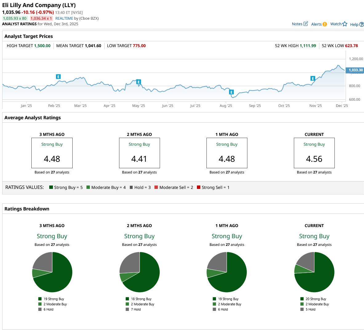 Eli Lilly is a clear buy, as indicated by the market rating of “Strong Buy” from analysts. However, its mean price target of $1,041.60 doesn’t show much room for improvement, given that the stock trades slightly above it, raising caution for potential investors.