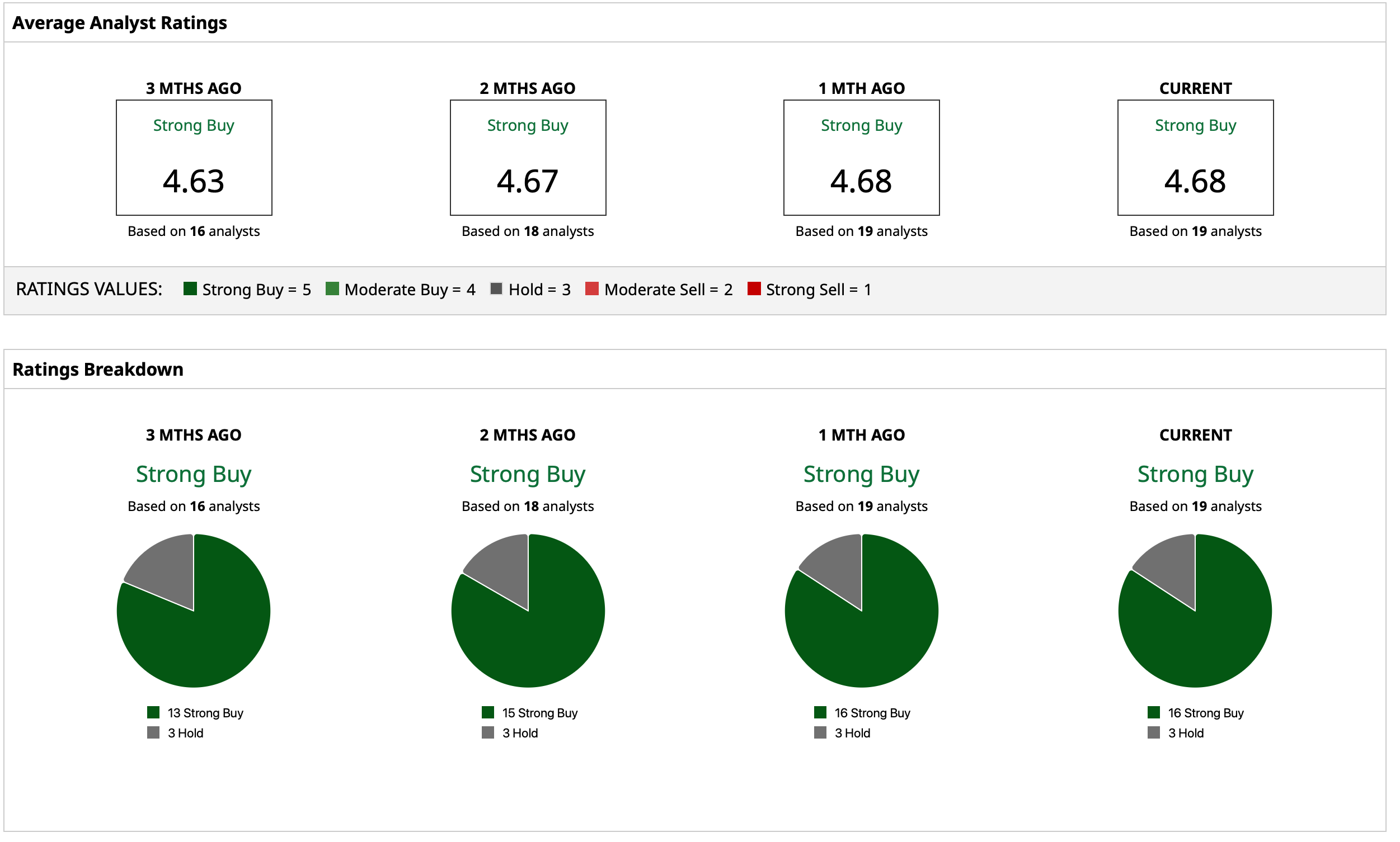 Thus, analysts have attributed a rating of “Strong Buy” for the stock with a mean target price of $242.33. This denotes an upside potential of about 39% from current levels. Out of 19 analysts covering the stock, 16 have a “Strong Buy” rating, and three have a “Hold” rating.
