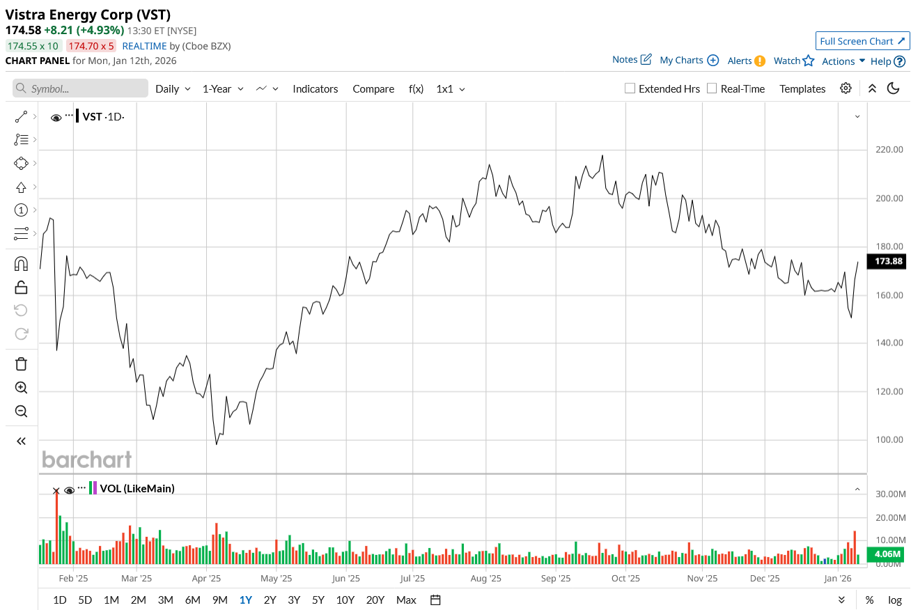 Valued at a market cap of $56.4 billion, the VST stock is up just 5% over the past year. And without the Meta news pop, the shares would have performed negatively. Meanwhile, the stock offers a modest dividend yield of 0.54%.