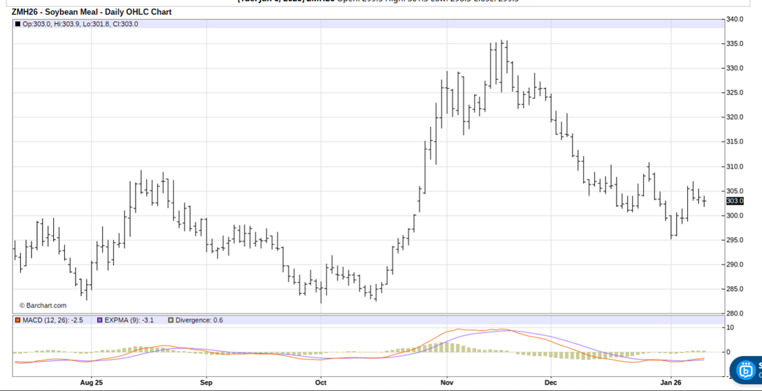March soybean meal (ZMH26) futures present a buying opportunity on more price strength.