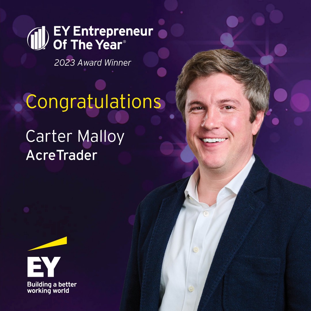 Fayetteville, Ark., June 27, 2023 (GLOBE NEWSWIRE) -- Ernst & Young LLP (EY US) announced that Carter Malloy, founder and CEO of AcreTrader was named an Entrepreneur Of The Year® 2023 Southwest Award winner on June 24 in Dallas. The Entrepreneur Of The Year Awards program is one of the competitive awards for entrepreneurs and leaders of high-growth companies. Malloy was selected by an independent judging panel made up of previous award winners, leading CEOs, investors and other regional business leaders. The candidates were evaluated based on their demonstration of building long-term value through entrepreneurial spirit, purpose, growth and impact, among other core contributions and attributes.
