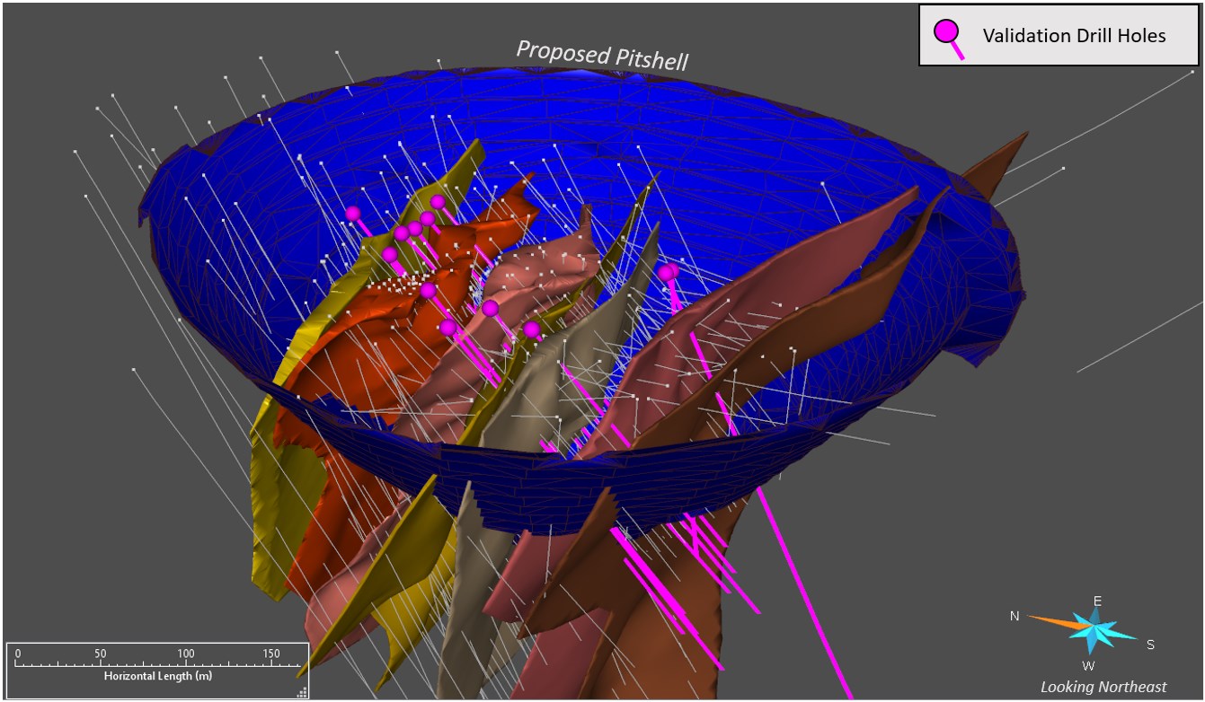 Figure 1: Validation drill holes in relation to pitshell and interpreted wireframes