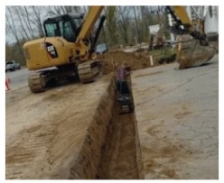 A construction site with heavy machinery digging a trench.