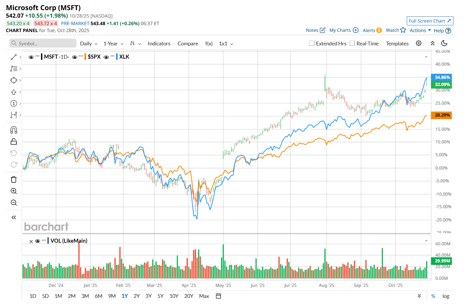 Shares of this software giant have outpaced the broader market over the past 52 weeks. Microsoft has rallied 25.4% over this time frame, while the broader S&P 500 Index ($SPX) has gained 18.1%. Moreover, on a YTD basis, the stock is up 28.5%, compared to SPX’s 17.2% uptick.