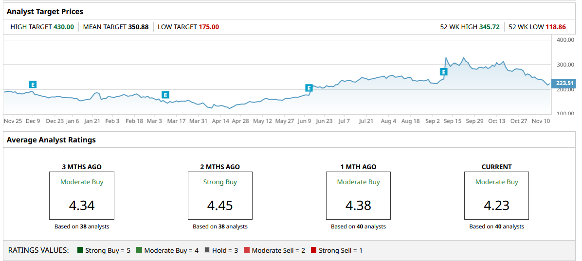 The highest price target is even higher than Mizuho's at $430, with the average price target at $350.88. Their price targets are less aggressive on average. Stifel has a "Buy" rating with a $350 target. Evercore ISI recently lifted its target to $385 with an "Outperform," Barclays moved its target to $400 on AI momentum, and Citizens has a "Market Outperform" rating with a $342 target.