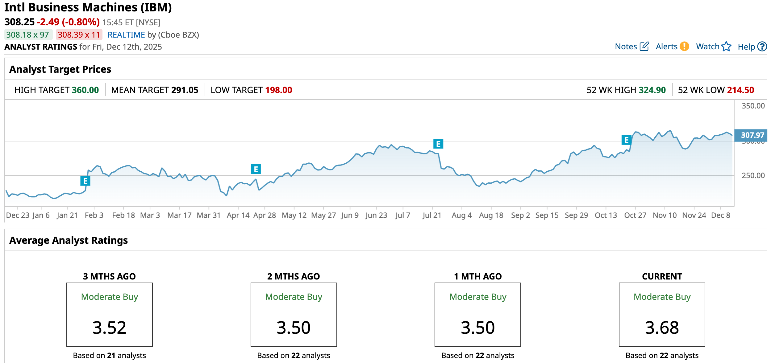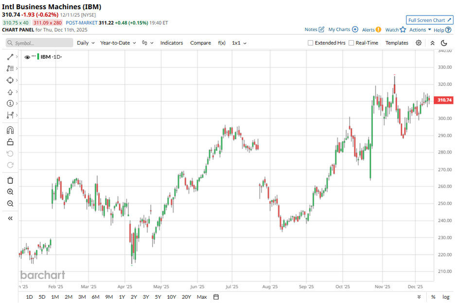 Over the past 52 weeks, the stock has gained 32.35% and 39.83% year-to-date (YTD), a notable increase that has outpaced broader market performance and reflects strong investor confidence in the company’s transformation. The stock is just 5.5% down from its 52-week high of $324.90 reached on Nov. 12, propelled by major announcements at IBM’s Quantum Developer Conference, particularly the unveiling of its new IBM Quantum Nighthawk processor.