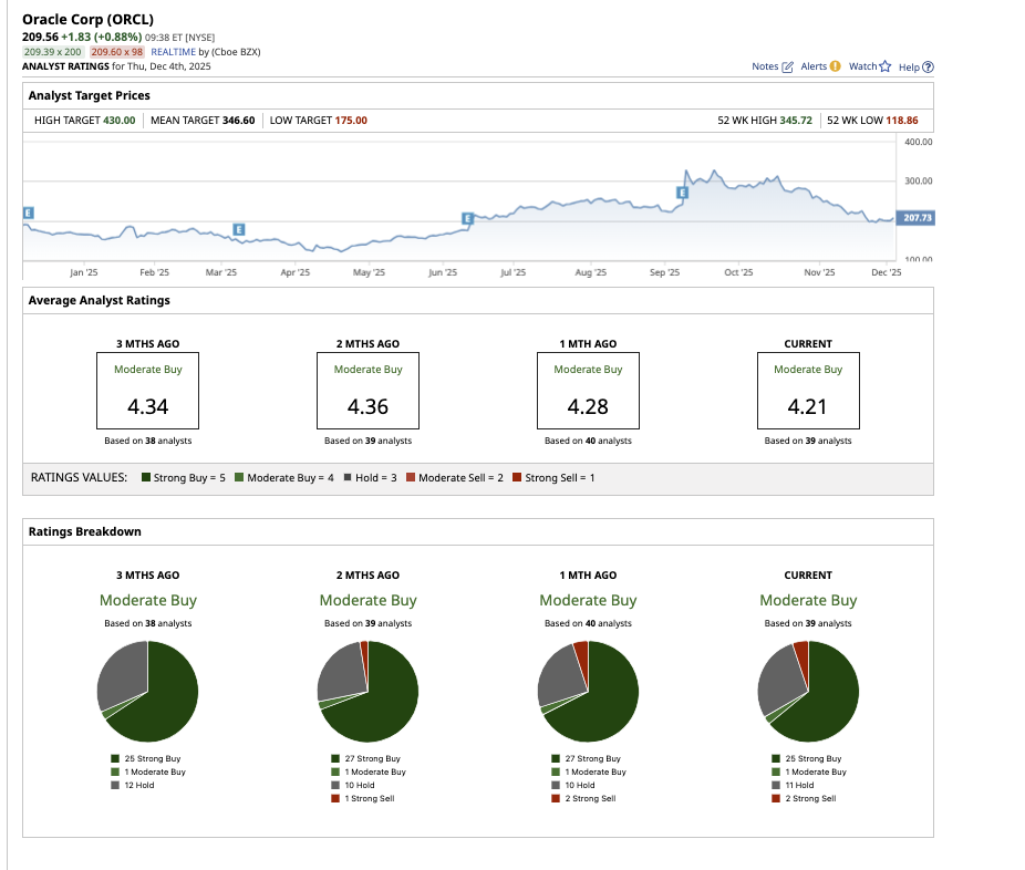 Overall, Wall Street rates Oracle stock a “Moderate Buy.” Out of the 39 analysts covering the stock, 25 rate it a “Strong Buy,” one says it is a “Moderate Buy,” 11 rate it a “Hold,” and two say it is a “Strong Sell.” The average target price for Oracle stock is $346.60, representing potential upside of 67% from its current levels. The high price estimate of $430 suggests the stock can rally as much as 107% this year.