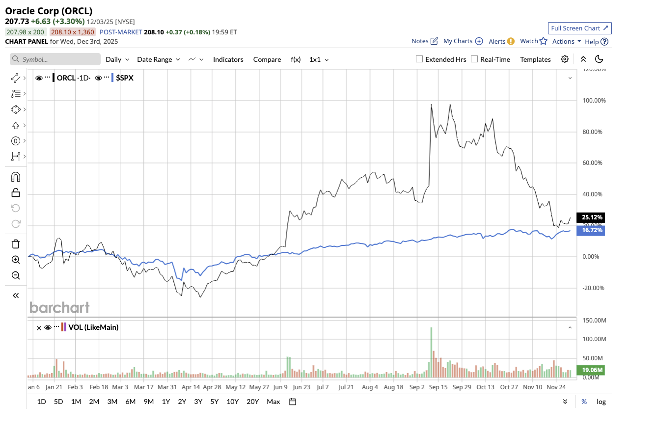 Oracle stock is up 27% YTD, but is trading nearly 40% below its 52-week high of $345.72. Oracle is set to release its second-quarter fiscal 2026 earnings on Dec. 10.