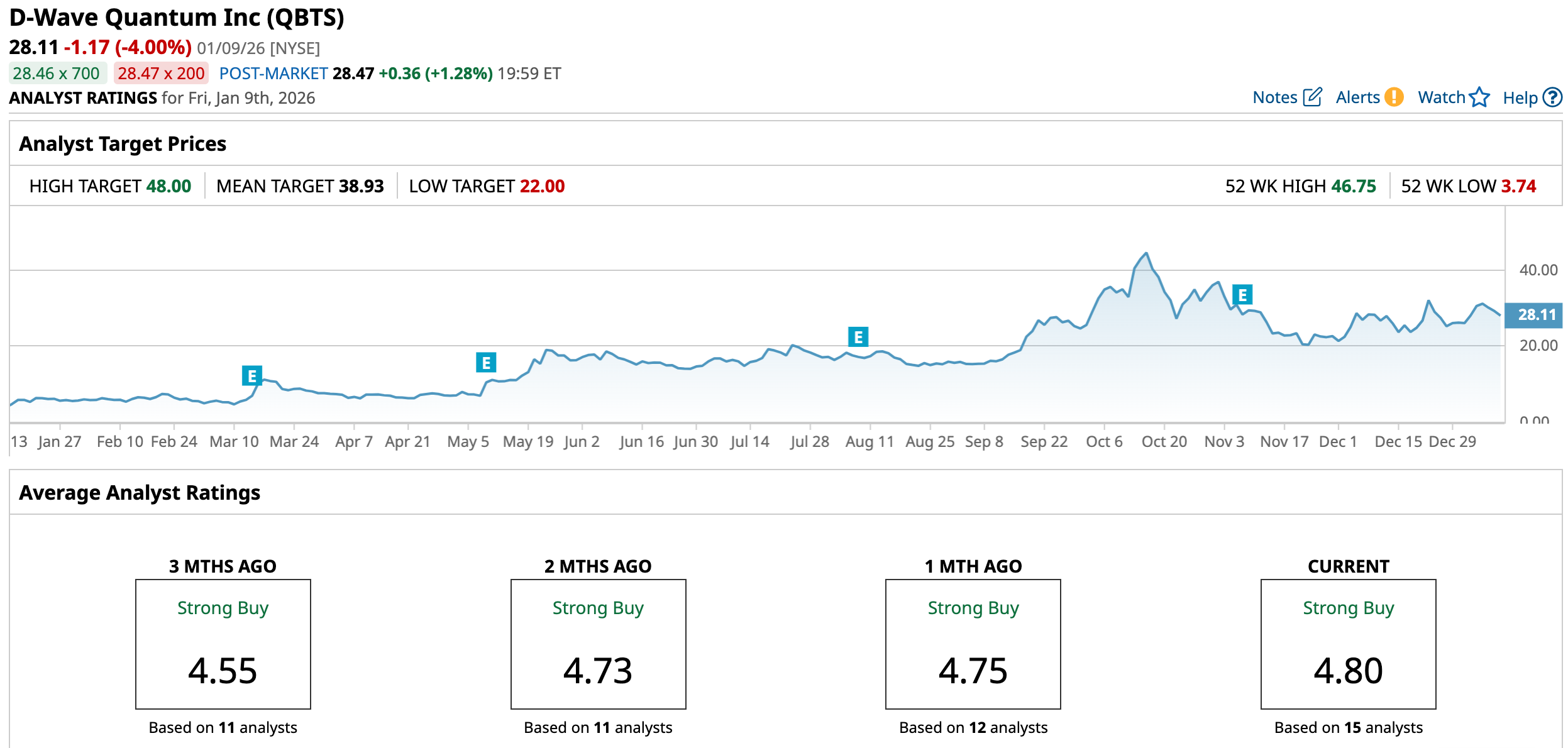 Of 15 analysts surveyed, 13 rate QBTS a consensus “Strong Buy," one as a “Moderate,” and one as a “Hold,” and the mean target is $38.93. Against the current price of $28.11, that implies a 38.5% upside.