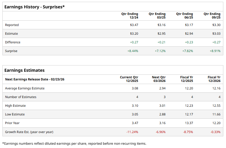 SBAC is scheduled to report its Q4 earnings soon. Ahead of the event, analysts expect the company to report an AFFO of $3.08 per share, down 11.2% from $3.47 per share in the same quarter of the previous year. The company has surpassed Wall Street's bottom-line estimates in the past four quarters.