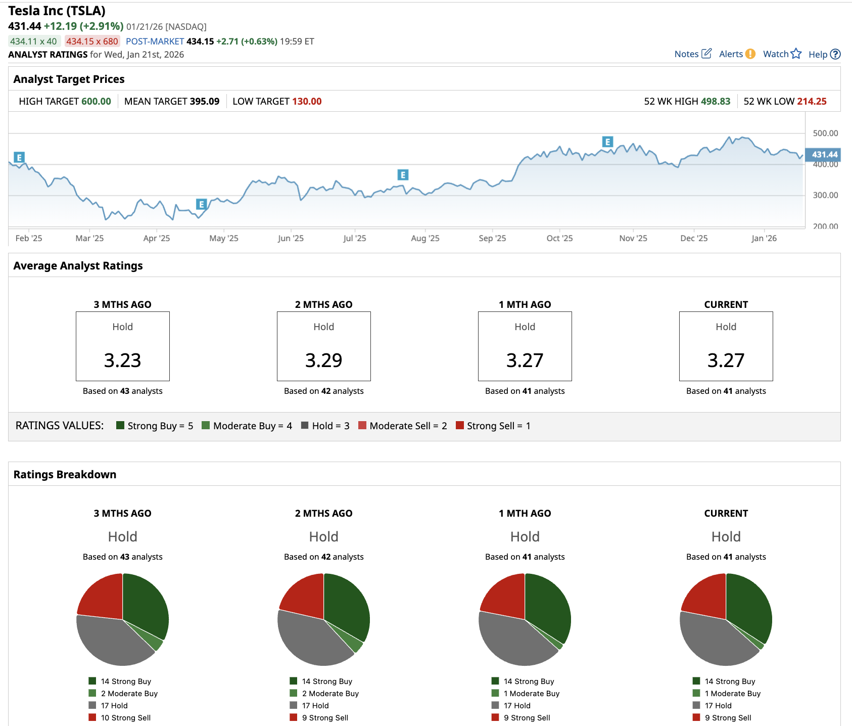 Out of the 41 analysts covering TSLA stock, 14 recommend “Strong Buy,” one recommends “Moderate Buy,” 17 recommend “Hold,” and nine recommend “Strong Sell.” The average TSLA stock price target is $395.09, below the current price of $431.