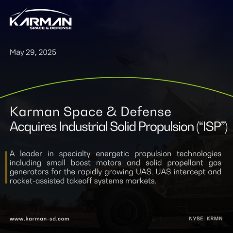 Karman Space & Defense (“Karman”, “Karman Holdings, Inc.” or “the Company”) (NYSE: KRMN), a leader in the rapid design, development and production of critical, next-generation system solutions for launch vehicle, satellite, spacecraft, missile defense, hypersonic and UAS customers today announced it has acquired ISP, a leader in specialty energetic propulsion technologies including small boost motors and solid propellant gas generators for the rapidly growing UAS, UAS intercept and rocket-assisted takeoff systems markets. The transaction closed on May 28, 2025.
