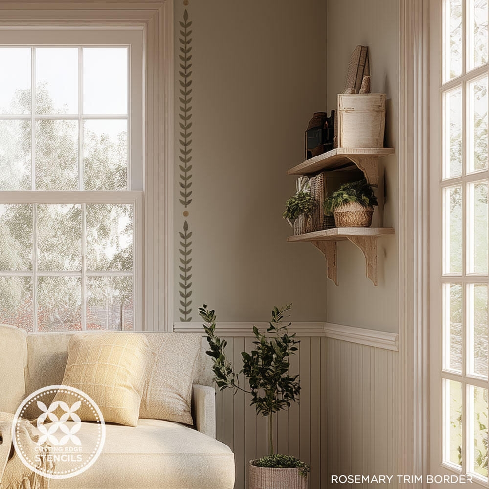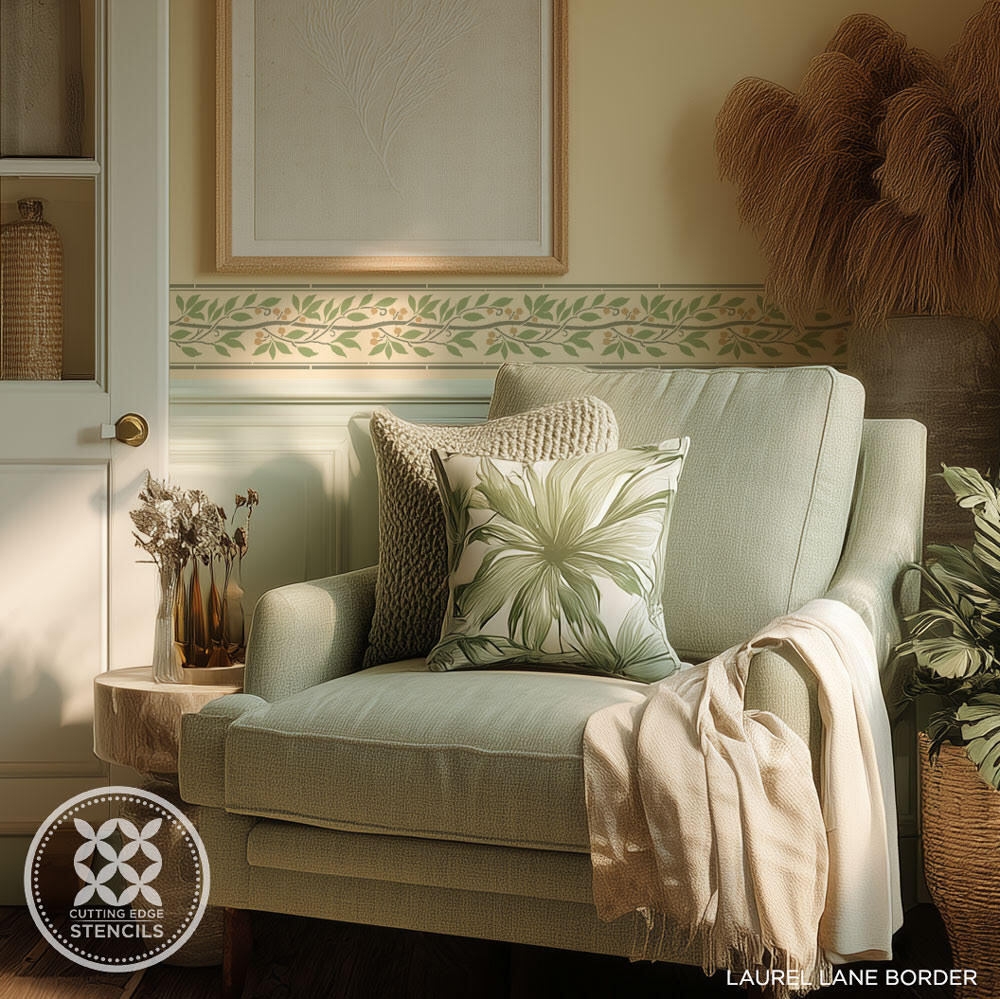 Each of the six stencil designs in the collection tells a different story. The Willowberry Wreath Stencil evokes the circular motifs found in historic textile patterns, while the Carnation Charm Stripe Stencil recreates the delicate vertical florals that once adorned Victorian parlors. The Periwinkle Vine Stripe blends botanical accuracy with decorative repetition, a combination that professional designers have long used to create visual movement in static spaces. The three border designs such as Laurel Lane, Rosemary Trim, and Carnation Swag, offer architectural detailing that disappeared from most American homes after the mid-century modern movement.