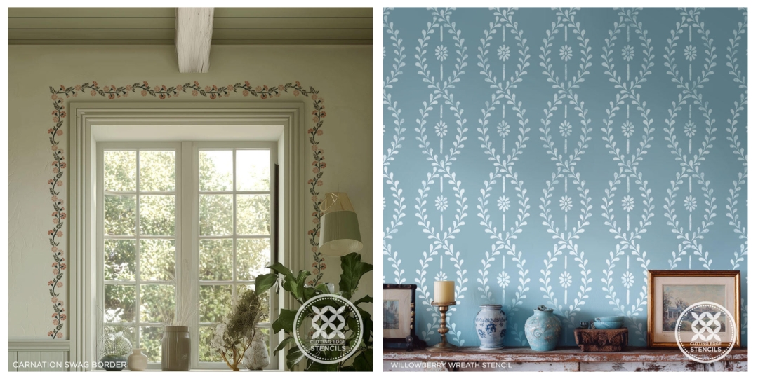 The Cottage Stencil Collection is available at www.cuttingedgestencils.com, with pricing starting at $34.95. International shipping extends availability beyond North American markets.