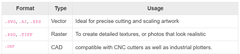 They're usually in vector-based formats such as .SVG, .AI, or .EPS (ideal for cutting machines) as well as in raster formats such as .PSD to create print mockups.